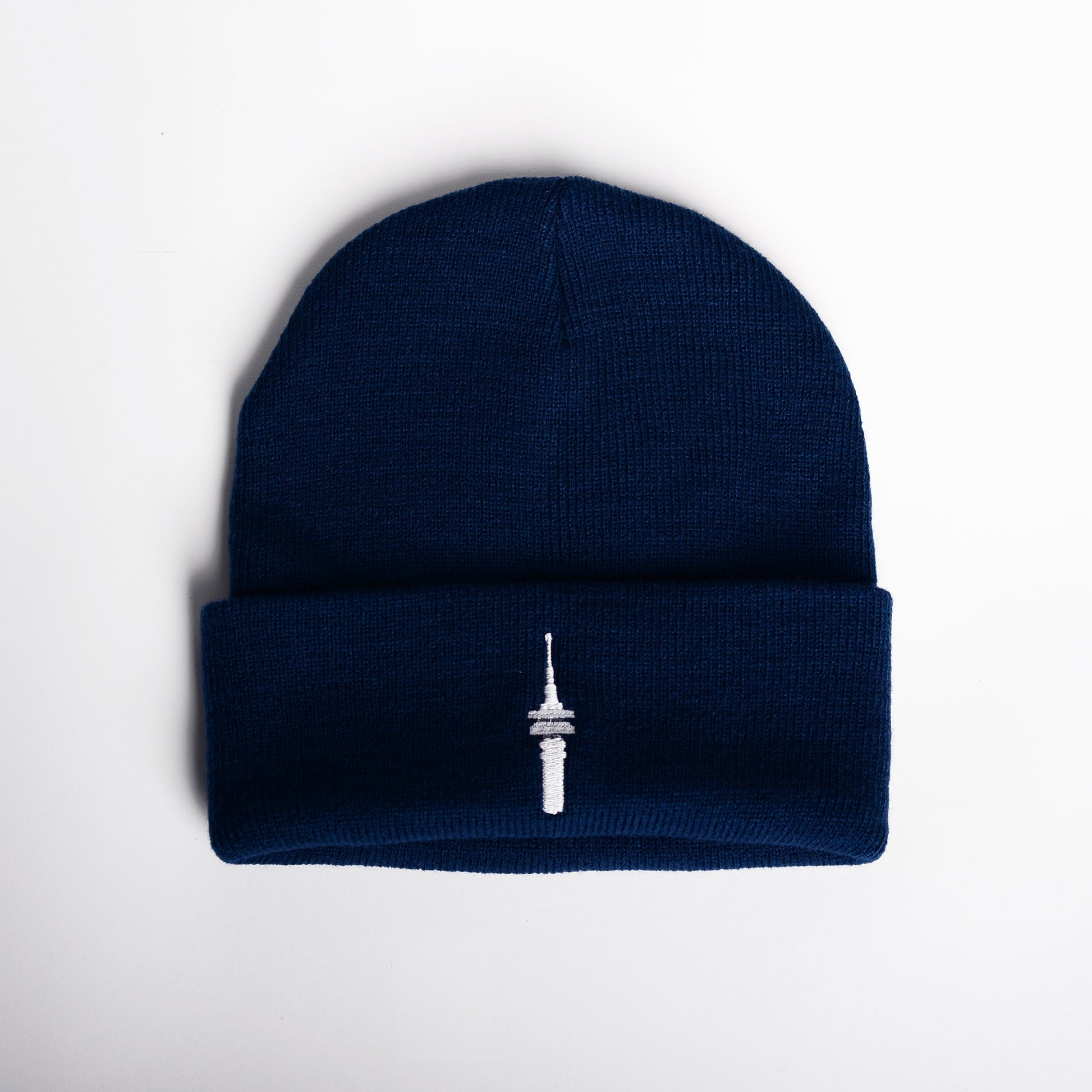 Hímzett, puha, meleg, menő kötött sapka Tv-toronnyal az elején.