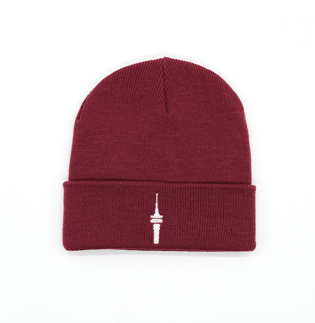 Hímzett, puha, meleg, menő kötött sapka Tv-toronnyal az elején.