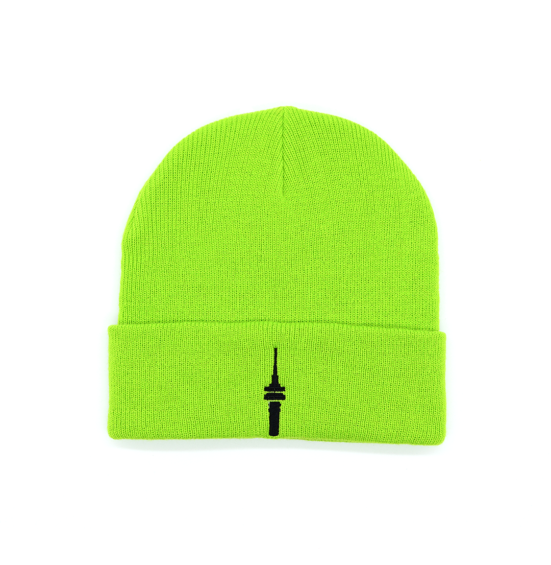 Hímzett, puha, meleg, menő kötött sapka Tv-toronnyal az elején.